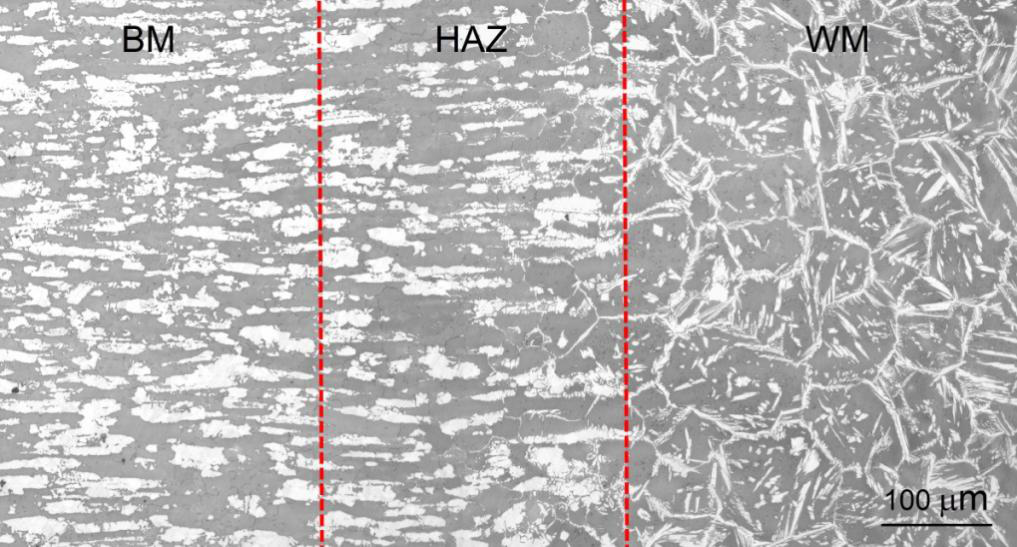 焊接過程是一個快速加熱與快速冷卻的熱循環過程。焊接接頭的組織可以分為三個部分:熔合區、熱影響區和母材。雙相不銹鋼的熔合區為鑄態組織,屬于鐵素體凝固模式,一次凝固相為單相鐵素體。焊接接頭的熱影響區根據距離焊縫熔池距離不同可分為高溫熱影響區和中低溫熱影響區。高溫熱影響區幾乎為單相鐵素體組織,高溫熱影響區的兩相比例一方面取決于鋼的化學成分,另一方面取決于焊接熱輸入、冷卻速度度等因素。中低溫熱影響區基本上處于兩相平衡區,在冷速較慢的情況下,可能會產生金屬間析出相。熱影響區晶粗大且易于產生析出相,大大降低了材料的沖擊性能和點蝕性能。
