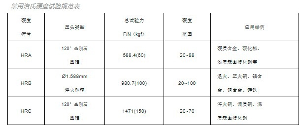 洛氏硬度試驗采用三種試驗力,三種壓頭,它們共有9種組合,對應于洛氏硬度的9個標尺。這9個標尺的應用涵蓋了幾乎所有常用的金屬材料。常用的有HRA、HRB和HRC三種。